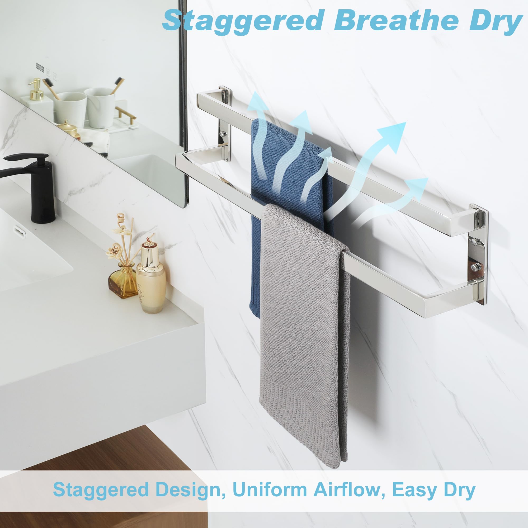 - Innovative Dual-Tier Design - Our bathroom towel holder feature an innovative dual bar layout, offering generous hanging space and blending functionality with a streamlined, sophisticated look.